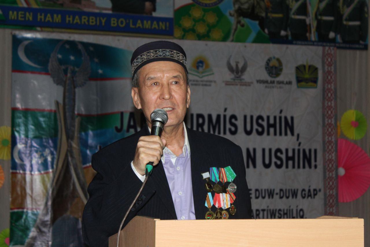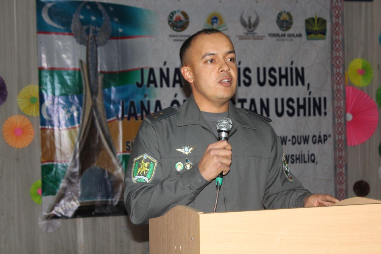 Илажда Ўатанымыздың ғәрезсизлигин және де беккемлеў, халқымыздың тынышлығын қәстерлеп сақлаў, жасларды ўатансүйиўшилик руўхында тәрбиялаў, мәрт әскерлеримизди ҳүрметлеп мәмлекетимиздиң тынышлығы ҳәм қәўипсизлиги жолындағы хызметлерин қәдирлеў, сондай-ақ, ўатанды көздиң қарашығындай қорғаў ҳәр биримиздиң әдиўли ўазыйпамыз екенлиги атап өтилди.