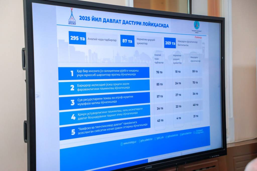 Комитет баслығының орынбасары Азамат Тошев «Өзбекстан-2030» стартегиясының 5 бағдары кесиминде 2025-жыл ушын мөлшерленген әмелий илажлар, нормативлик-ҳуқықый ҳүжжетлер дизими ҳәм мақсетли көрсеткишлер мәмлекетимиздиң турақлылығын ҳәм халық абаданлығын кепиллеўге хызмет ететуғын әҳмийетли стратегиялық ҳүжжет екенин атап өтти.