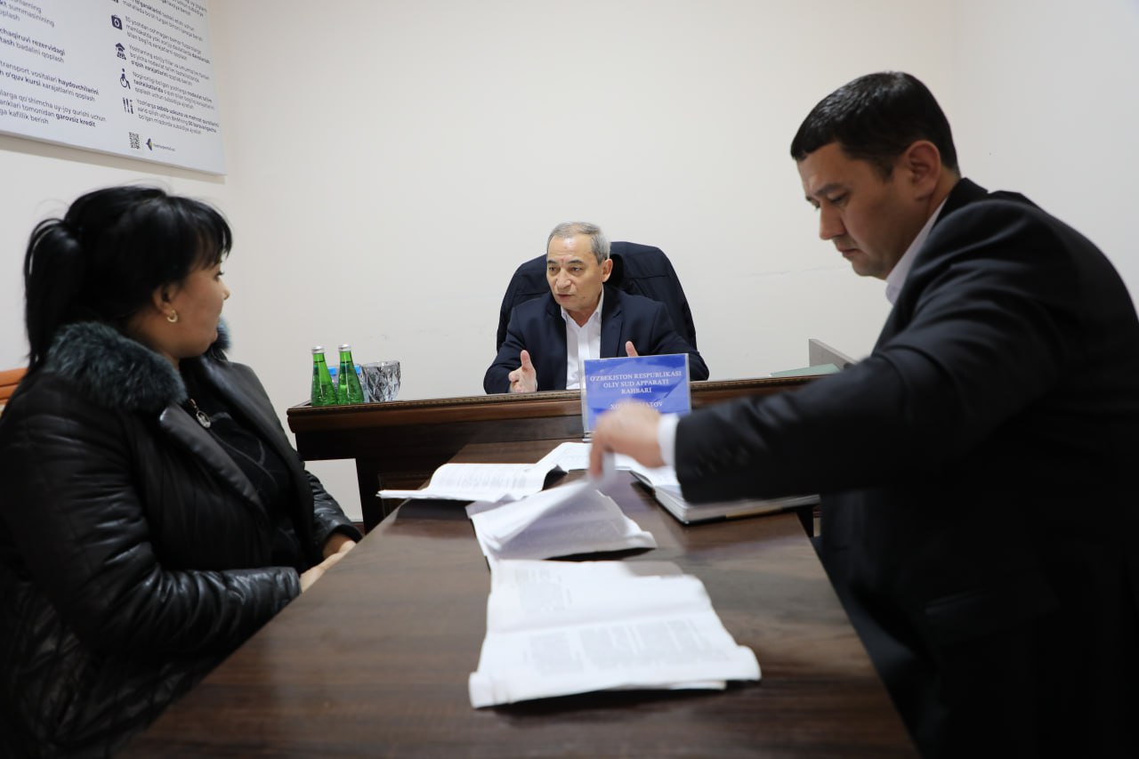 Қабыллаўда Өзбекстан Республикасы Жоқарғы суды баслығының орынбасары Ш.Полвонов ҳәм Жоқарғы судтың аппарат баслығы А.Холмахматовлар пуқаралардың суд системасына байланыслы мүрәжатлерин тыңлады.
