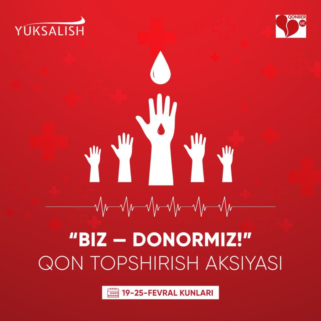 “Юксалиш” ҳәрекети усы ўазыйпалардың орынланыўын тәмийинлеў мақсетинде, аймақлық қан қуйыў орайлары менен биргеликте 2025-жылдың 18-25-февраль күнлери “Биз донормыз” қан тапсырыў акциясын өткериўи режелестирилген.