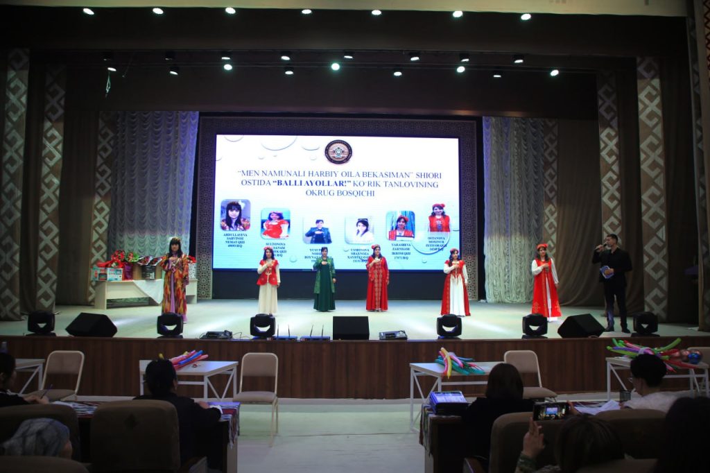 Мәмлекетимизде жәмийеттиң ажыралмас бөлеги есапланатуғын заманагөй шаңарақты раўажландырыў, шаңарақ институтын және де беккемлеў, улыўма инсаныйлық, миллий үрп-әдет ҳәм дәстүрлеримизге терең ҳүрмет ҳәм сыйласықты беккемлеў, әскерий хызметкерлердиң шаңарақ ағзаларының мәдений дем алысларын тәмийинлеў, олардың руўхый дүньяға көзқарасларын кеңейтиў, интеллектуаллық потенциалларын және де арттырыў мақсетинде шөлкемлестирилип атырған “Бәрекалла, ҳаяллар” таңлаўында жәми алты қатнасыўшы сахнада өзлериниң шеберлигин көрсетти.