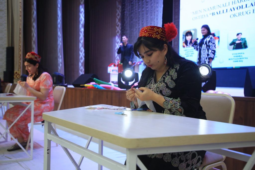 “Шебер үй бийкеси” деп аталған таңлаўдың екинши шәртинде қатнасыўшылар реңли ийирилген жиплер менен пишиў усылында ҳәр қыйлы безеўлерди тоқыды.