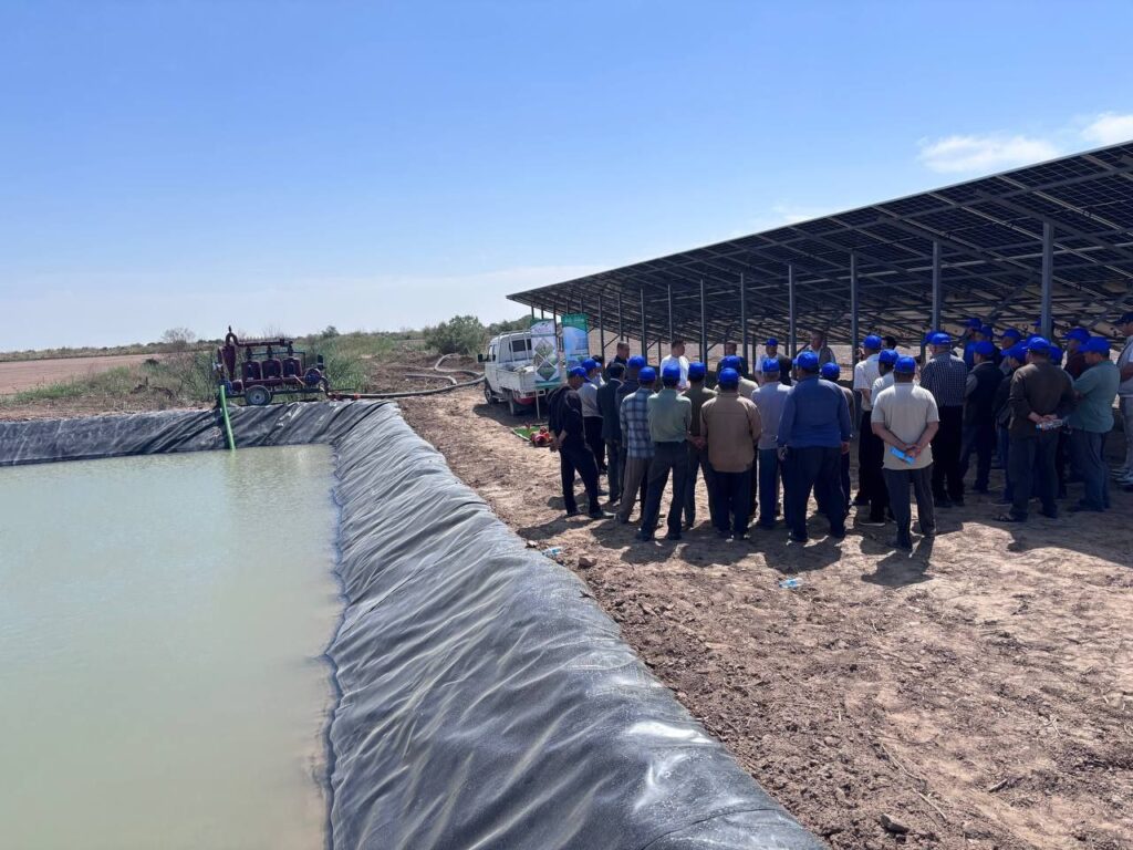 Сондай-ақ, район ҳәкими орынбасарының қатнасыўында, «Суў жеткерип бериў хызмети» мәмлекетлик мәкемеси ҳәм қурылыс шөлкемлериниң жуўапкерлери менен биргеликте районда суўды үнемлеўши технологияларды енгизиў бойынша әмелге асырылып атырған жумыслар ҳәм келешектеги ўазыйпалар додаланды. Мағлыўмат ушын, бул фермер хожалығы 33 гектар майданға Қытай технологиясы тийкарында шигит егип, 825 миллион сумлық өз қаржылары есабынан тамшылатып суўғарыў технологиясын енгизмекте. Әлбетте, бул технологияның ислеўи ушын насос агрегаты зәрүр, ол болса, электр энергиясы менен ислейди. Фермер хожалығы ағзалары бул мәселеге де заманагөй, альтернатив усылдан пайдаланды. Бул аймақта электр тармақлары болмағаны ушын 200 миллион сум есабынан 50 киловаттлық қуяш панеллерин орнатды.