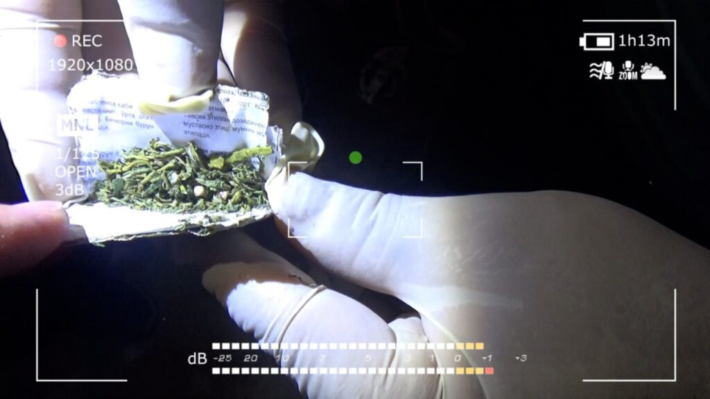“Ташкент-Нөкис” жөнелисинде ҳәрекетленип киятырған жеңил автотранспорт қуралы тоқтатылып, усы автотранспорттағы жолаўшы ҳәм оған тийисли болған сумкалар гүўалардың қатнасыўында көзден өткерилгенде, пуқараның үстиндеги ишки кийимлерине жасырын түрде жасырылған 2 дана мөлдир полиэтилен пакетлерде өткир ийисли, тоқ қоңыр реңдеги, орамы менен салмағы 58,12 грамм болған “гашиш” нәшебентлик заты бар екенлиги анықланды.