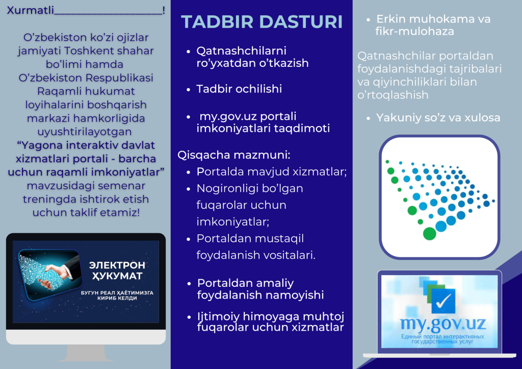 Усындай сораўларға жуўап табыў мақсетинде Санлы ҳүкимет жойбарларын басқарыў орайы ҳәм Өзбекстан көзи әззилер жәмийетиниң Ташкент қалалық бөлими менен биргеликте “Бирден-бир интерактив мәмлекетлик хызметлер порталы – ҳәмме ушын санлы имканиятлар” атамасында илаж болып өтти.