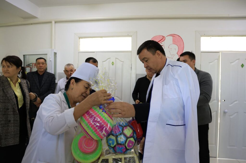 Район ҳәкими А.Аметов емлеўхананың балалар бөлимине барып, әмелге асырылған жумыслар менен жақыннан танысты ҳәм “Меҳирли инсанлар” фонды ўәкиллерине миннетдаршылық билдирип, балаларға арналған естелик саўғаларын тапсырды.
