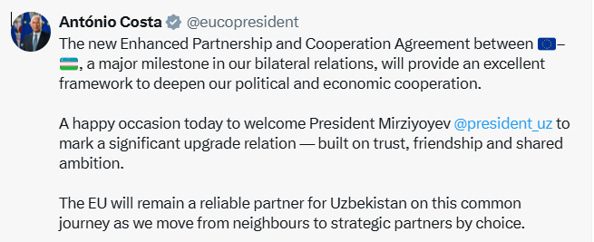 Европа кеңесиниң Президенти Антониу Кошта социаллық тармақтағы бетинде Европа Аўқамы ҳәм Өзбекстан арасындағы кеңейтилген шериклик ҳәм бирге ислесиў ҳаққындағы жаңа келисим (EPCA) “сиясий ҳәм экономикалық байланысларды тереңлестириў ушын әжайып тийкар болатуғынын” атап өтип, бул ҳүжжетти еки тәреплеме қатнасықлардың “әҳмийетли басқышы” деп атады.