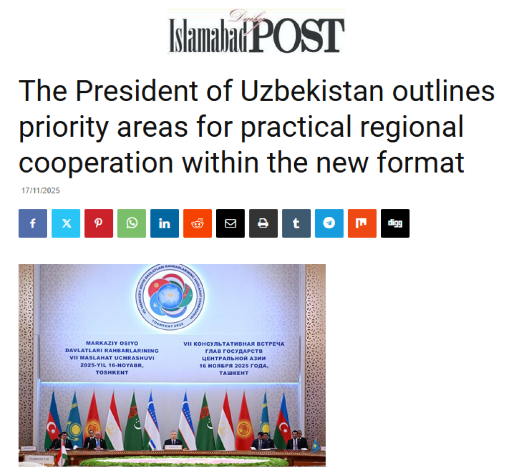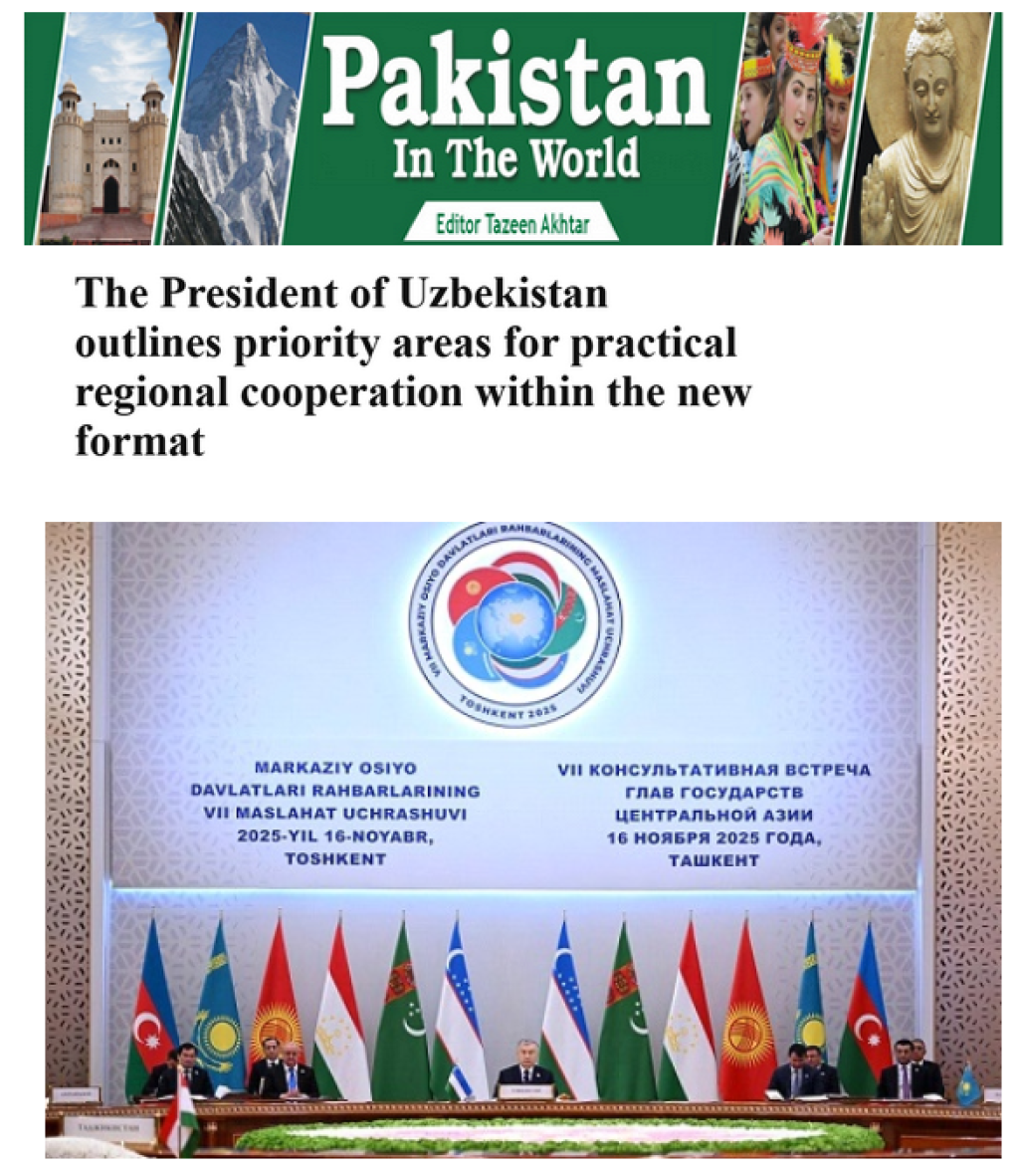 Пакистанның жетекши ғалаба хабар қураллары Ташкентте болып өткен Орайлық Азия мәмлекетлери басшыларының жетинши Мәсләҳәт ушырасыўын кеңнен сәўлелендирди. Соның ишинде, орайлық “Global News Pakistan”, “Daily Spokesman” “Islamabad Post” ҳәм “Pakistan in the World” басылымларының бетлеринде Өзбекстан Президенти жаңа форматтағы регионаллық бирге ислесиўдиң тийкарғы бағдарларын көрсетип бергенине айрықша итибар қаратылған.