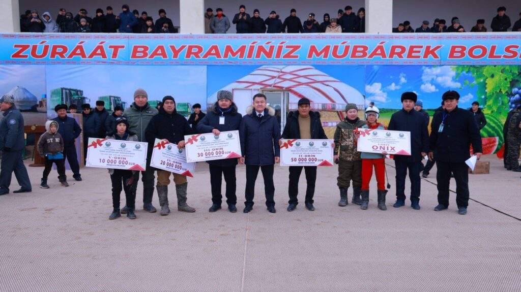 Сондай-ақ, байрам тамашасында өткерилген 7 айлаў бойынша 1-орынға 30 млн. сум, 2-орынға 20 млн. сум, 3-орынға 15 млн. сум, 5 айлаў бойынша 1-орынға 20 млн. сум, 2-орынға 15 млн. сум, 3-орынға 10 млн. сум, 5 айлаўға жорға жарысында 1-орынға 20 млн. сум, 15 млн. сум, 3-орынға 10 млн. сум, 3 айлаўға 1-орынға 10 млн. сум, 2-орынға 5 млн. сум, 3-орынға шаң жутқыш, 1 айлаў тай шабысқа 1-орынға музлатқыш, 2-орынға телевизор, 3-орынға шаң жутқыш тапсырылды.