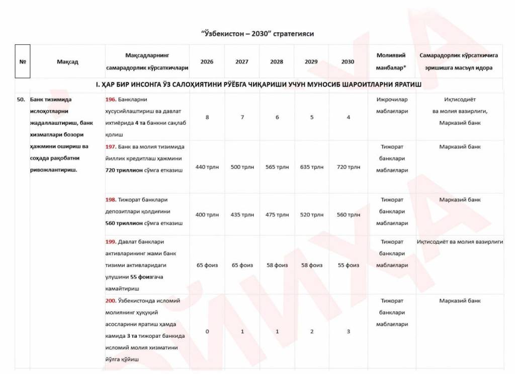 “Өзбекстан-2030” стратегиясы мәмлекеттиң банк-финанс системасын түп-тийкарынан жаңалаўды нәзерде тутады. Ҳүжжетте банклердиң экономикадағы роли, олардың нәтийжелилиги ҳәм бәсекиге шыдамлылығын арттырыўға қаратылған бир қатар анық мақсетлер белгиленген.