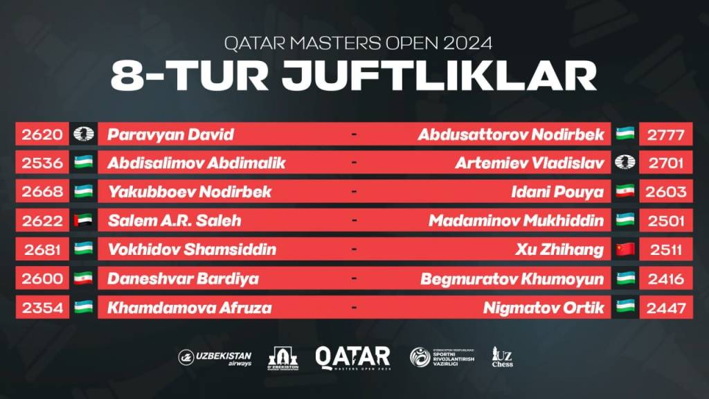 “Qatar Masters-2024”ning 7-turida 4 nafar shaxmatchimiz g‘alabaga erishdi