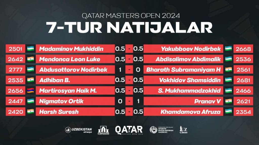 Qatar poytaxti Doha shahrida shaxmat bo‘yicha davom etayotgan “Qatar Masters-2024” xalqaro turnirining kecha o‘tkazilgan 7-tur bahslari sarhisobiga ko‘ra, “A” guruhida ishtirok etayotgan 15 nafar shaxmatchimizning 4 nafari g‘alabaga erishdi, 8 nafari durang qayd etdi, 3 nafari imkoniyatni boy berdi.