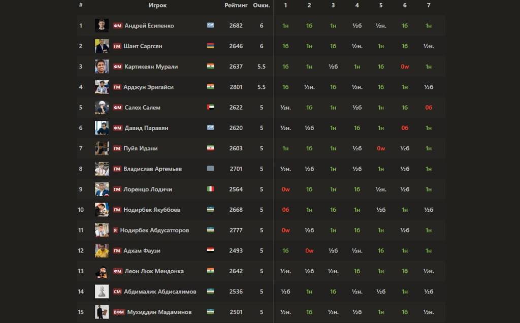 138 nafar mahoratli shaxmatchi qatnashayotgan “A” guruhining 7-tur o‘yinlarida Nodirbek Abdusattorov oq donalarda hindistonlik Bxarat Subramaniyamni dog‘da qoldirib, ochkolari sonini 5 taga yetkazib oldi. Ushbu g‘alaba turnirda ikkinchi raqamda tasniflangan shaxmatchimizning 11-o‘ringa ko‘tarilib olishini ta’minladi.