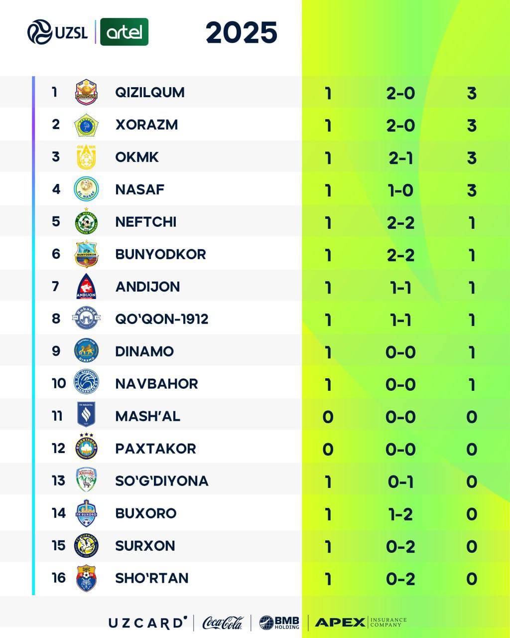 Ma’lumot o‘rnida: Superliganing birinchi tur yakunlariga ko‘ra, OKMK, “Nasaf“, “Qizilqum“ va “Xorazm“ mavsumni g‘alaba bilan boshladi va 3 ochkoga ega bo‘ldi. “Qo‘qon 1912”, “Andijon“, “Bunyodkor“, “Neftchi“, “Navbahor“ va “Dinamo“ jamoalari esa o‘z hisobiga bir ochkoni yozib qo‘ygan bo‘lsa, “Buxoro“, “Surxon“, “So‘g‘diyona“ hamda “Sho‘rtan“ klublari mag‘lubiyatdan so‘ng liganing quyi pog‘onalariga joylashdi.
