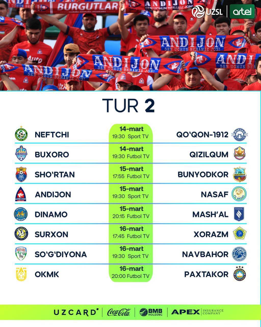 Milliy chempionatimizda ertaga, 15 mart kuni “Sho‘rtan” – “Bunyodkor”, “Dinamo” – “Mash’al”, “Andijon” – “Nasaf”, 16 mart kuni esa “So‘g‘diyona” – “Navbahor”, “Surxon” – “Xorazm” va OKMK – “Paxtakor” jamoalari raqobatiga guvoh bo‘lamiz.