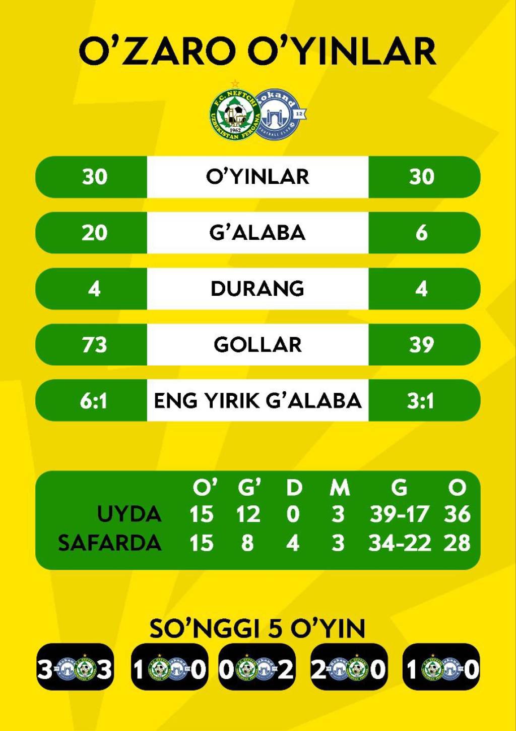 Ushbu jamoalar shu kunga qadar milliy chempionatimiz doirasida jami 30 marta o‘zaro kuch sinashgan. Uchrashuvlarning 20 tasida farg‘onaliklar g‘alaba qozongan bo‘lsa, 4 o‘yinda durang natija qayd etilgan. Qo‘qon shahri jamoasi esa 6 ta bahsda zafar quchgan. Umumiy to‘plar nisbati 73/39 “Neftchi” foydasiga.
