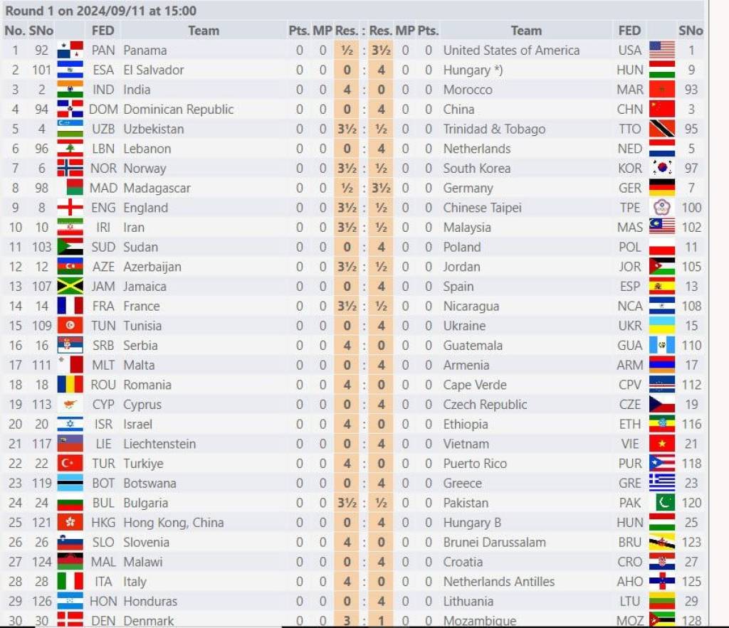 Будапешт шаҳрида 45-Бутунжаҳон шахмат олимпиадасининг эркаклар ўртасида кечган 1-тур ўйинлари якунларига кўра, 89 та жамоа муваффақиятга эришди. Уларнинг 56 таси рақибларини тўлиқ устунлик ҳолатида енгди. Яъни, ҳар бир жамоанинг 4 нафар шахматчиси тўлиқ ғалаба қилди. Ҳамюртларимиз Тринидад ва Тобаго терма жамоасини 3,5:0,5 ҳисобида мағлуб этди.