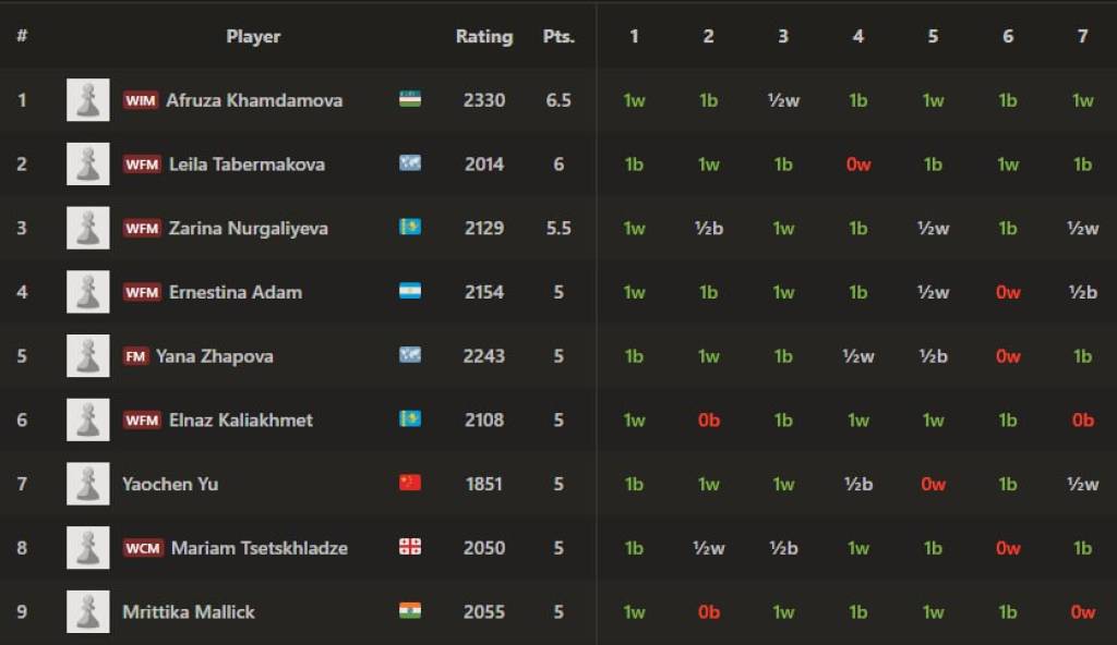 Нилуфар Имомқўзиева, Кесари Мгеладзе (Грузия), Юньцин Чжао (Хитой), Диана Ҳофизова (ФИДЕ) ўз ёш тоифаларида 6 очко билан турнир жадвалида етакчига айланган. Шунингдек, 1 нафари 5,5, 11 нафари 5 очко билан чемпионлик йўлида кураш олиб бормоқда.