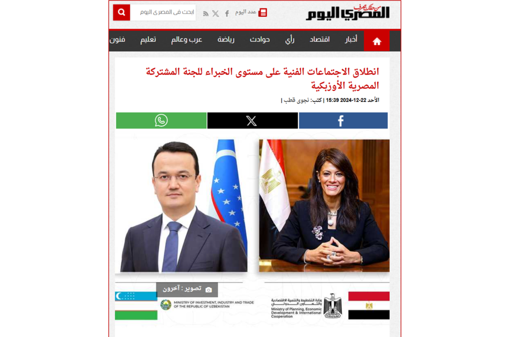 “Миср бугун” нашри 22 декабрь, якшанба куни Тошкент шаҳрида вазирлар қўмитасини чақиришга тайёргарлик кўриш мақсадида Ўзбекистон – Миср иқтисодий, илмий ва техник ҳамкорлик бўйича қўшма қўмитаси еттинчи мажлиси доирасидаги экспертлар йиғилиши бошланганини ёзди. Қайд этилишича, 15 йилдан кейин биринчи марта ўтказилаётган мазкур тадбир мамлакатимиз инвестициялар, саноат ва савдо вазири Лазиз Қудратов ҳамда Мисрнинг режалаштириш, иқтисодий ривожланиш ва халқаро ҳамкорлик вазири Рания Машат раҳбарлигида ўтказилади.