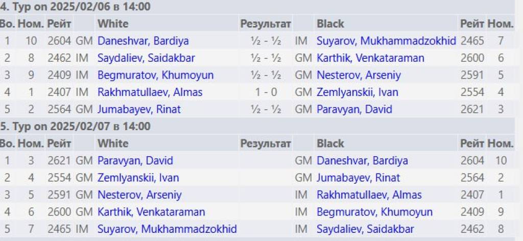 “Челленжер” гуруҳидаги мусобақаларда ФИДЕ байроғи остида ҳаракатланаётган Давид Паравян ортда қолган 4 та турдан кейин 3,5 очко билан пешқадамлик қилмоқда. Ҳамюртларимиздан Ҳумоюн Бекмуродов 2 очко билан қўшимча кўрсаткичларга кўра, 10 нафар иштирокчи орасида 5-ўринда бормоқда.
