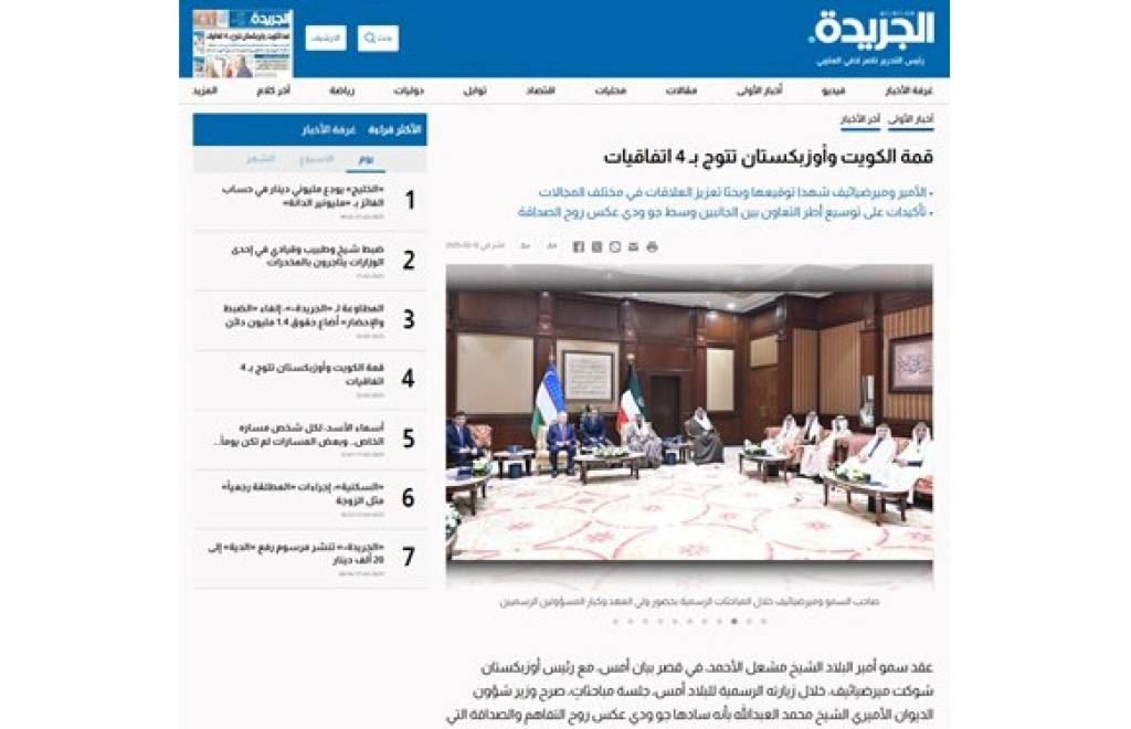 “Ал-Жарида” нашри Ўзбекистон Республикаси Президенти Шавкат Мирзиёев Кувайт Давлати Амири Шайх Мишъал Ас-Сабоҳнинг таклифига биноан расмий ташриф билан ушбу мамлакатга келганини кенг ёритди. Мақолада олий даражали музокара ўтказилгани, Саммит кун тартибидан дўстлик ва кўп қиррали шериклик муносабатини янада мустаҳкамлаш, сиёсий, савдо-иқтисодий, инвестиция-молиявий ва маданий-гуманитар соҳалардаги ҳамкорлик кўламини кенгайтириш масалалари ўрин олгани таъкидланган.