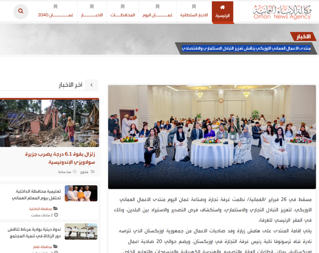Ўмон Султонлигида Ўзбекистон билан савдо, сармоя алмашинувини кенгайтириш, икки давлат экспорт ва импорт имкониятини ўрганиш мақсадида бизнес-форум ташкил қилинди. Ушбу араб давлати Савдо-саноат палатаси қароргоҳида бўлиб ўтган анжуман тафсилоти ONA ахборот агентлиги саҳифаларида кенг ёритилди.