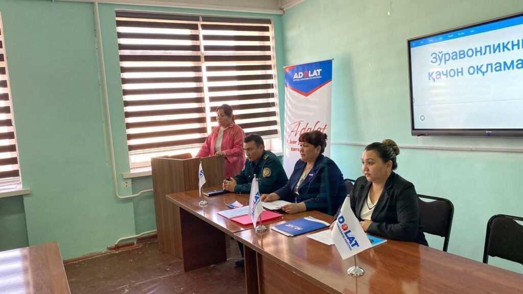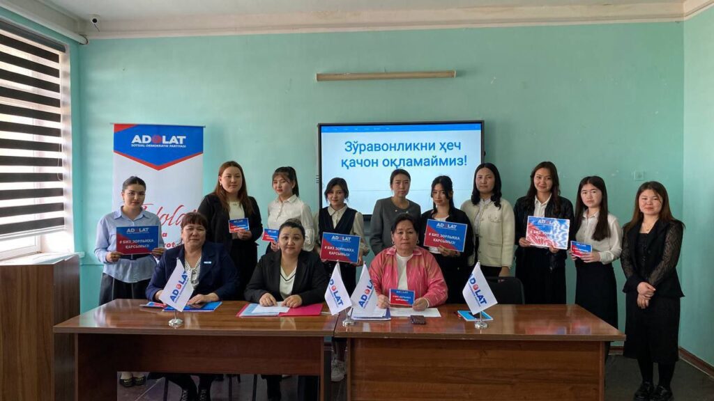Ўзбекистон «Адолат» СДП Қорақалпоғистон Республикаси Кенгаши томонидан хотин-қизларга нисбатан зўравонлик ва турли тазйиқ ўтказишга қарши курашиш бўйича республикамиздаги олий ўқув юртларида чора-тадбирлар олиб борилмоқда.