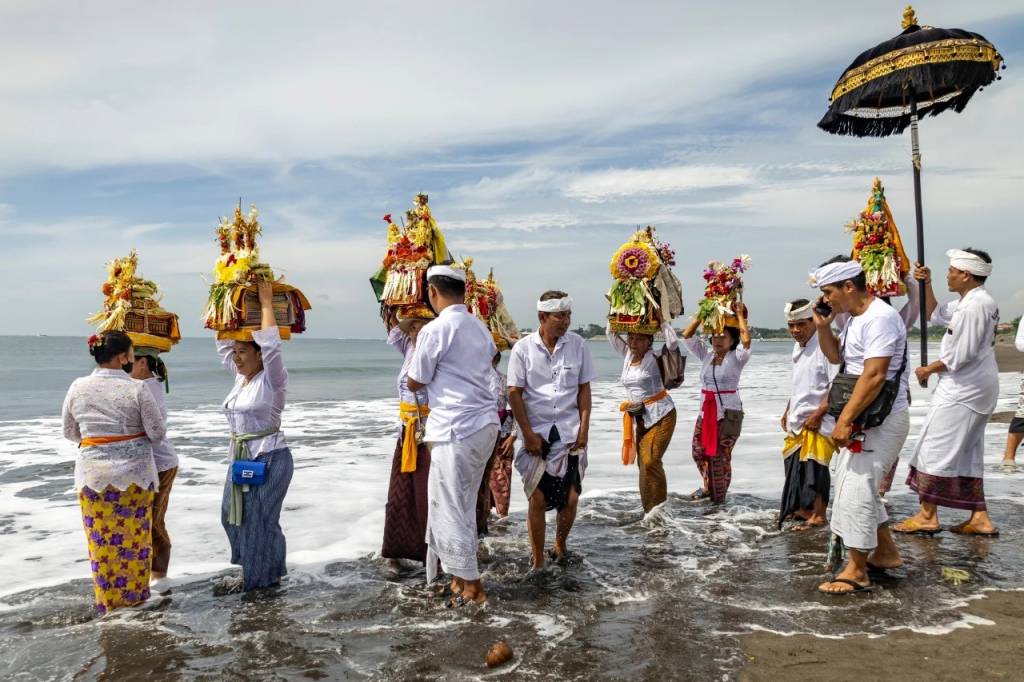 Индонезия. Бали ҳиндулари сув бўйида диний маросим уюштирмоқда.