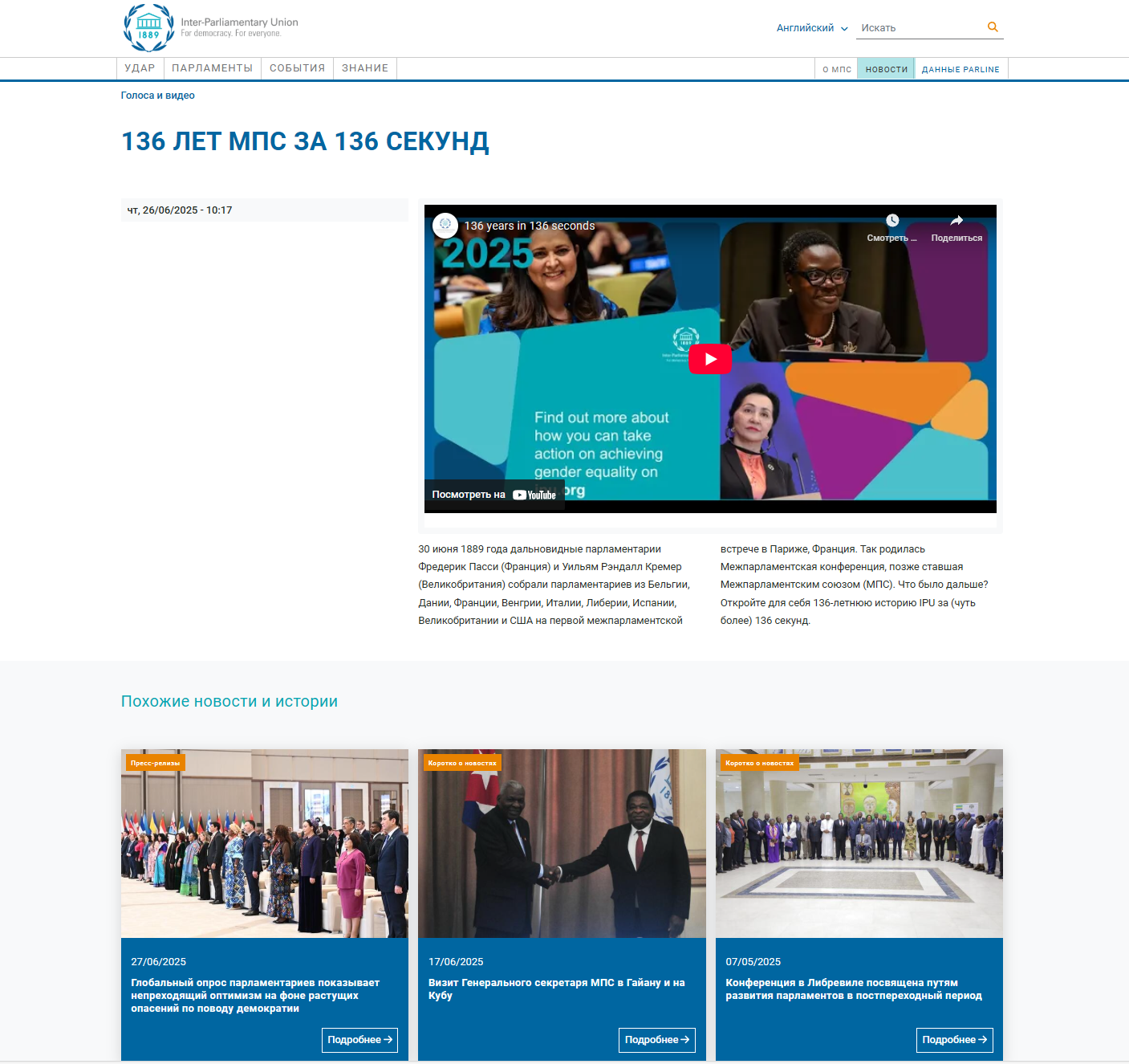Парламентлараро иттифоқ ташкил этилганининг 136 йиллигига бағишланган махсус видеороликда 2025 йилда Тошкентда муваффақиятли ўтказилган 150-Ассамблеянинг аҳамияти алоҳида таъкидлаб ўтилган. Ушбу тадбир халқаро парламентаризмни ривожлантириш ва демократик қадриятларни мустаҳкамлашда муҳим аҳамият касб этгани қайд этилади.