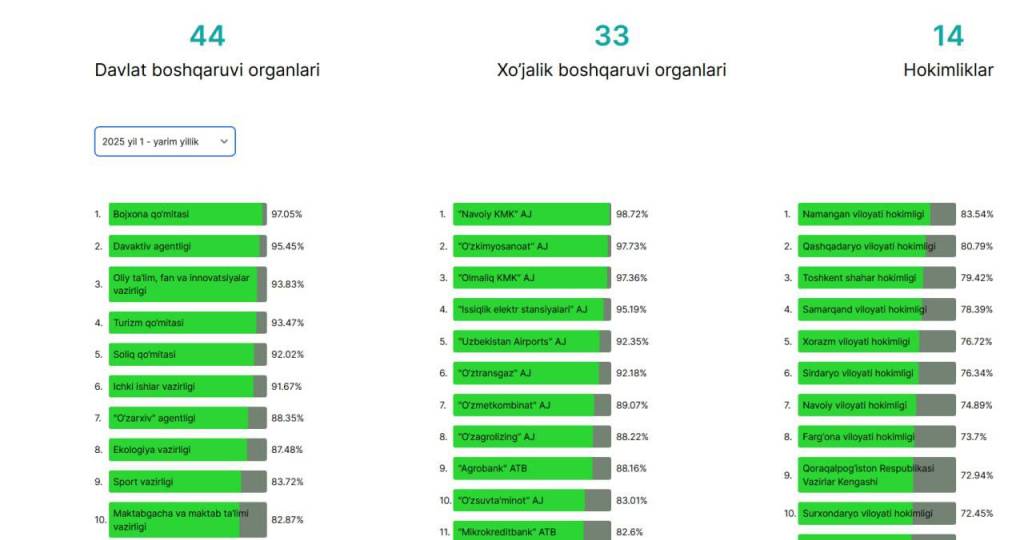 Кейинги ўринларни мос равишда Давлат активларини бошқариш агентлиги ҳамда Олий таълим, фан ва инновациялар вазирлиги эгаллади.