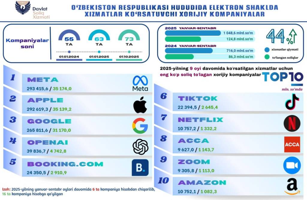 Маълумот учун, ушбу солиқларнинг 93 фоизи фақат 10 та йирик компания ҳиссасига тўғри келган. Meta — 35,2 миллиард сўм, Apple — 35,1 миллиард сўм, Google — 31,2 миллиард сўм, OpenAI — 4,7 миллиард сўм, Booking.com (https://booking.com/) — 2,9 миллиард сўм, TikTok — 2,6 миллиард сўм, Netflix — 1,3 миллиард сўм, Acca — 1,1 миллиард сўм, Zoom — 1,1 миллиард сўм, Adobe — 1 миллиард сўм солиқ тўлаган.