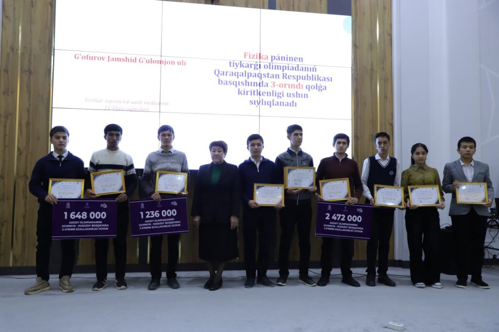 Сўнгра ғолиб ўқувчилар диплом ва пул мукофотлари билан тақдирланиб, биринчи ўрин эгаларига 2 472 000 сўм, иккинчи ўрин эгаларига 1 648 000 сўм, фахрли учинчи ўрин соҳибларига 1 236 000 сўм тантанали равишда топширилди.