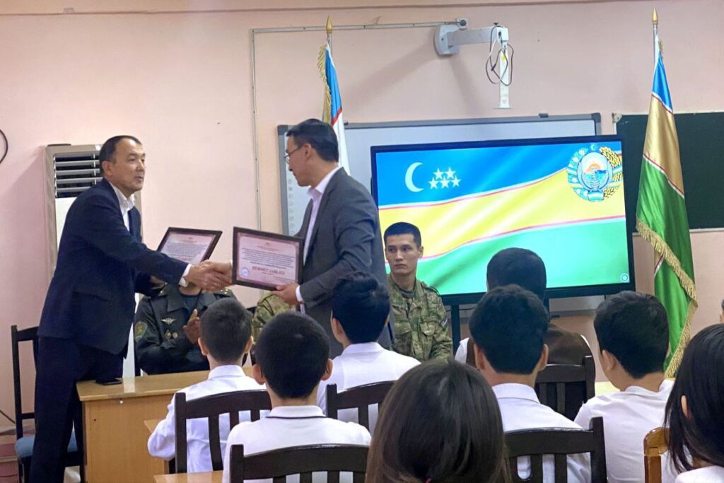 Унда Республика Маънавият ва маърифат маркази Нукус шаҳар бўлими бошлиғи Қ.Нуратдинов, Шимоли-ғарбий ҳарбий округининг 17071-ҳарбий қисм вакиллари М.Худайбергенов, У.Мирзанов, Д.Амиров, А.Юлдашев ҳамда Нукус шаҳар 1-сонли Эсжон бахши номидаги болалар мусиқа ва санъат мактаби ўқитувчилари Х.Сейтназаров ва А.Қайпановлар иштирок этди. Тадбирда давлат рамзининг аҳамияти ва унга ҳар бир фуқаро ҳурмат билан қараши лозимлиги таъкидланди.