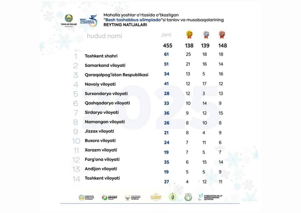 Ёшлар ишлари агентлиги қайси ҳудуд ёшлари нечта медални қўлга киритганини эълон қилди.