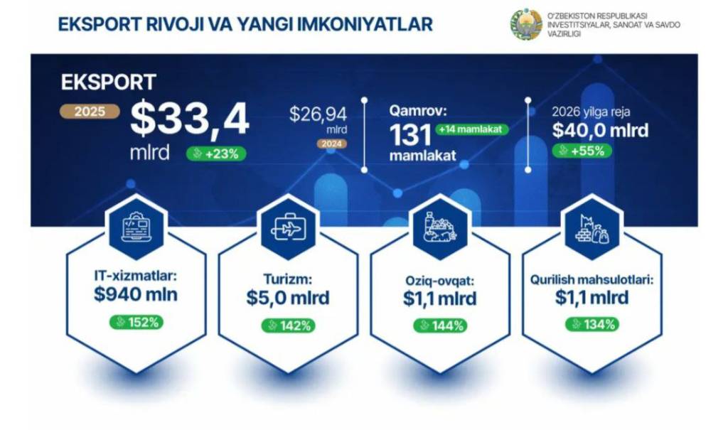 Қайд этилганидек, экспорт географияси 131 та мамлакатни қамраб олди. 2026 йилда бу кўрсаткич $40 миллиардни ташкил этиши кутилмоқда.