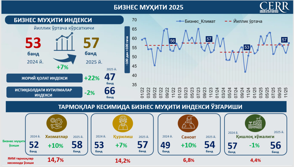 2025 йилда иқтисодиётнинг аксарият тармоқларида бизнес муҳитининг яхшиланиши кузатилди. Хизмат кўрсатиш соҳасида индекс 58 бандни ташкил этиб, 14,7 фоизга ўсди, қурилишда – 57 банд (+14,2 фоиз), саноатда эса – 54 банд (+6,8 фоиз) қайд этилди.