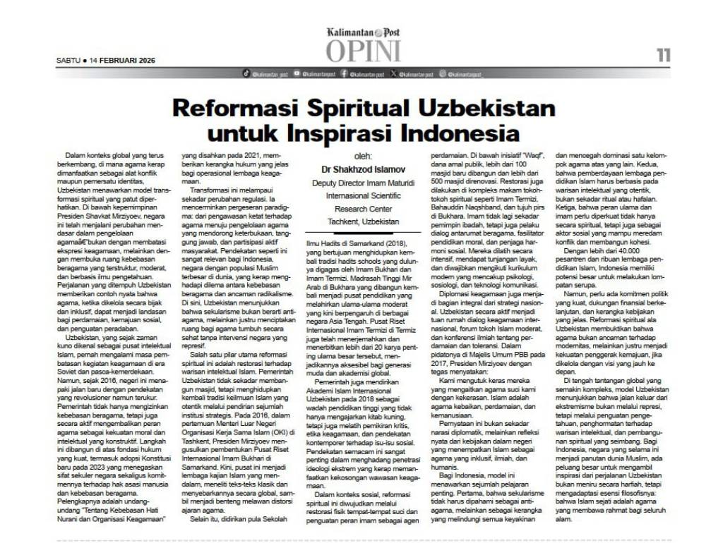 «Reformasi Spiritual Uzbekistan untuk Inspirasi Indonesia» («Ўзбекистоннинг диний соҳадаги ислоҳотлари Индонезия учун илҳом манбаи») номли мақолада мамлакатимизда диний соҳадаги очиқлик, бағрикенглик ва илм-маърифатга асосланган янгиланишлар атрофлича таҳлил қилинган.