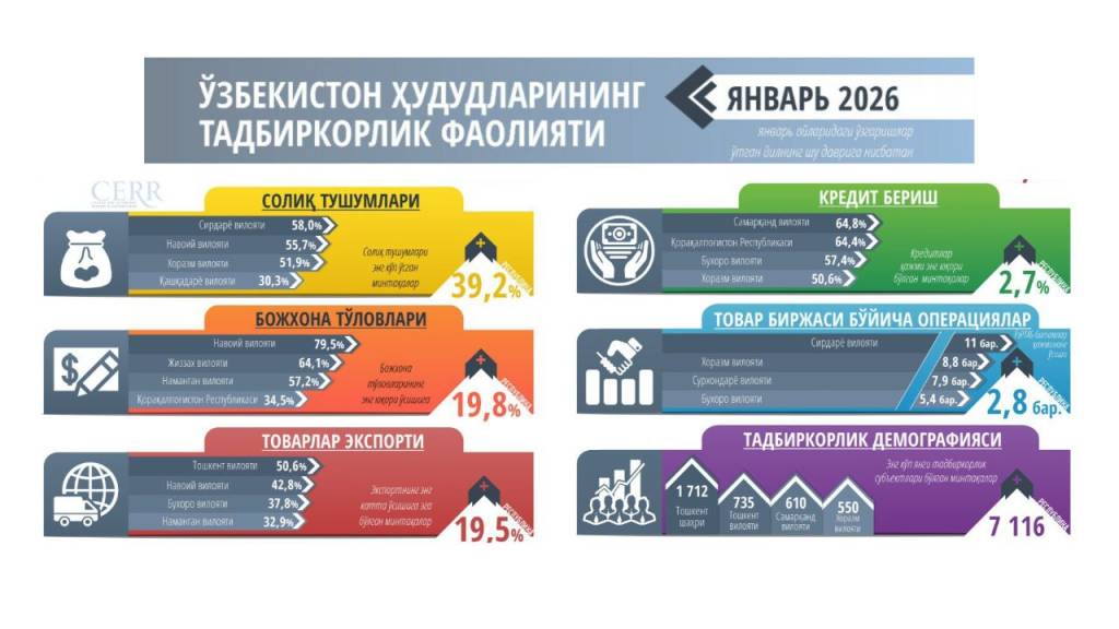 Хусусий секторнинг фаол ривожланиши янги хўжалик юритувчи субъектлар сонининг сезиларли ортгани билан ҳам тасдиқланмоқда. 2026 йил январь ойида 7 116 та янги корхона рўйхатдан ўтказилди. Янги тадбиркорлик субъектларининг энг кўп қисми Тошкент шаҳрида (1 712 та) қайд этилди. Ҳудудлар орасида эса Тошкент вилояти (735 та), Самарқанд вилояти (610 та) ва Хоразм вилояти (550 та) етакчилик қилди.