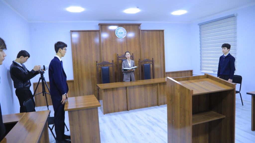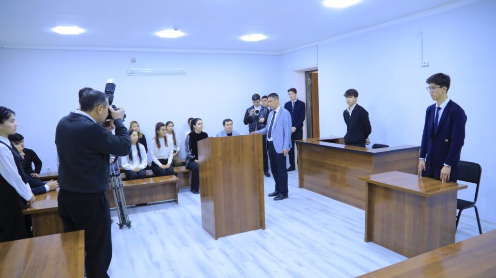 Шундан сўнг медиа-тур иштирокчилари факультетда ташкил этилган ўқув суд залига ташриф буюриб, суд жараёнларининг қандай ташкил этилиши ва амалга оширилиши билан танишди. Суд мажлисининг тузилмаси, судьяларнинг қарор қабул қилиш принциплари, прокурор ва адвокатларнинг процессуал роли, шунингдек, суд этикаси ҳақида батафсил тушунчалар берилди.